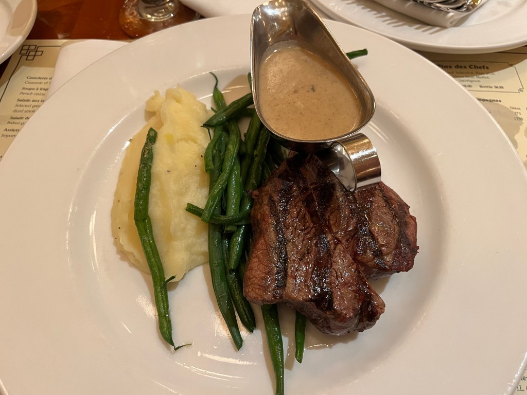 I enjoyed this meal as a party of three adults, and much like Les Chefs de France, we all ordered the filet, but with a variety of sides. One ordered an appetizer salade that received a good review.