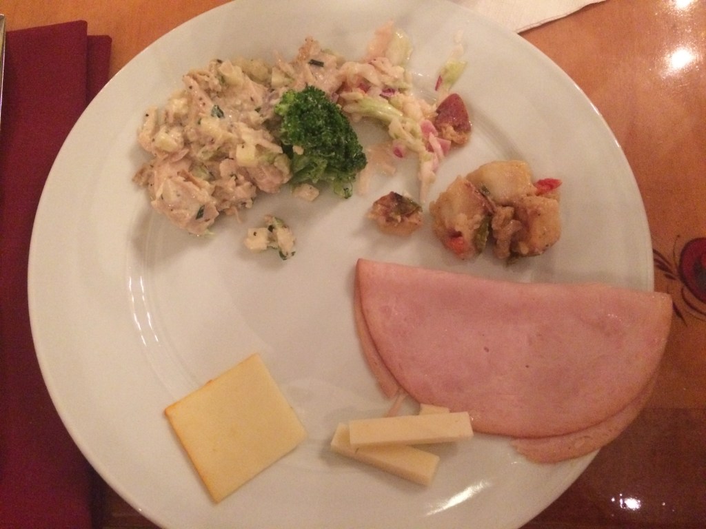 Akershus is an odd combination of buffet, menu, and family style service. The buffet is a “cold buffet” of mostly salads, meat, and cheeses that serves as the appetizer course of the dinner. You are welcome to fix your own plate and go back as much as you want.