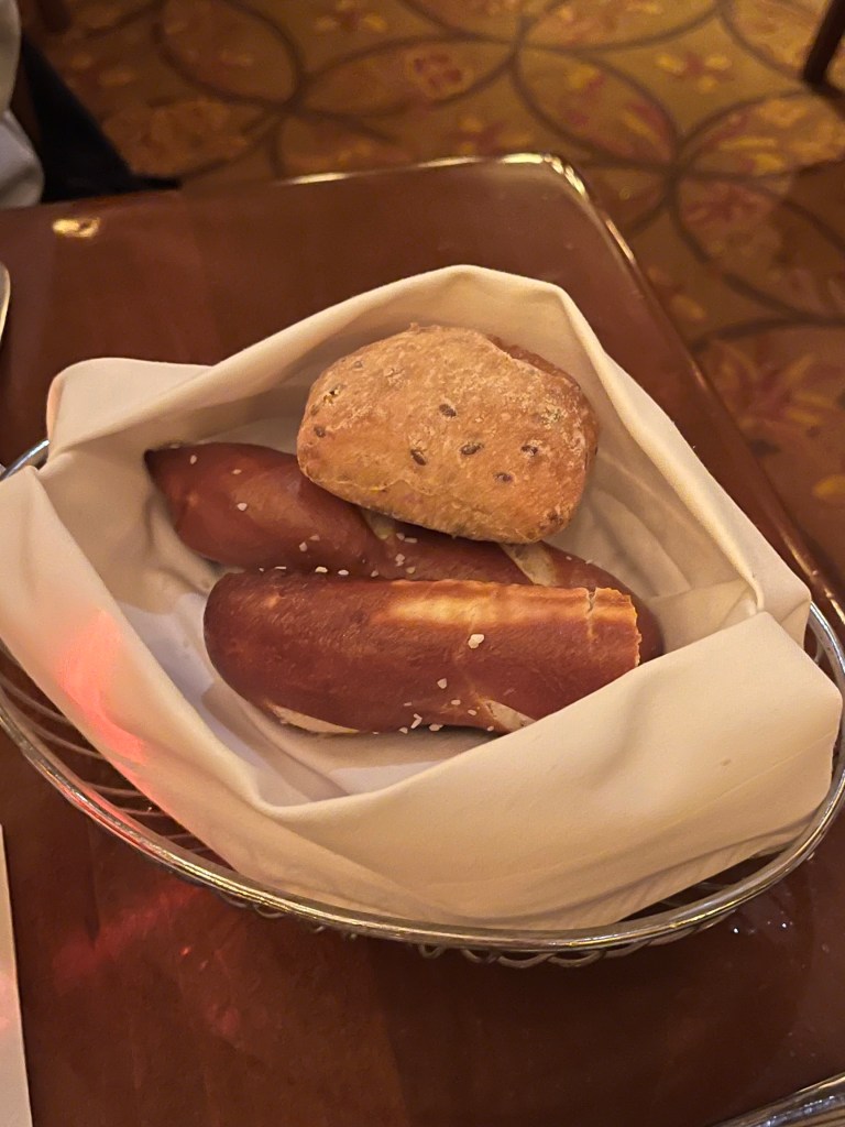 I was not expecting to love my meal here as much as I did. I ate here in October 2021 with a party of three adults and five kids. All three adults order the filet, and all five kids ordered the cheeseburger, so I don’t have much variety in my review, but both entrees received glowing reviews. The meal started with bread service, a basic baguette with butter.